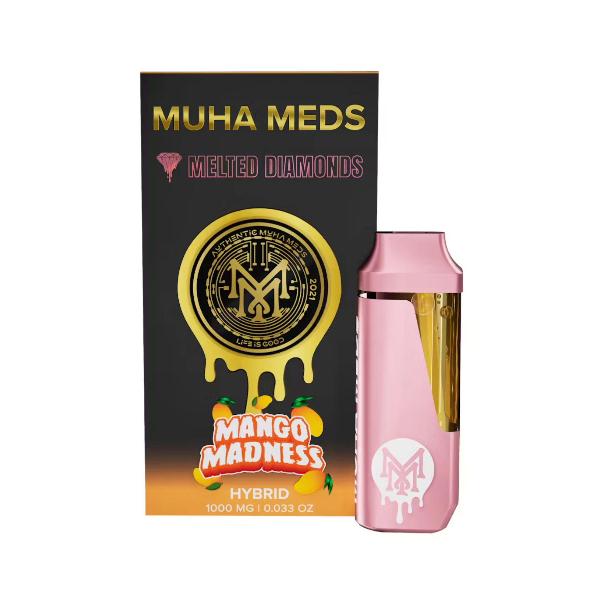 This balanced hybrid blends cerebral stimulation with physical relaxation, making it a versatile choice for any time of day. With sweet mango and citrus flavors accented by earthy notes, it offers a smooth and satisfying experience. | Muha Meds Melted Diamonds Disposables are extracted from freshly harvested flash-frozen cannabis, preserving the full spectrum of cannabinoids and terpene profile. This ensures a smooth, flavorful, and enjoyable vaping experience every time. Muha's disposables are sleek with a smooth matte finish, perfect for on the go use.